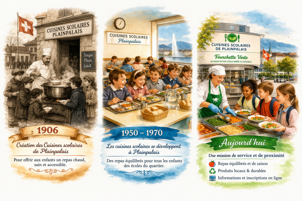 À Plainpalais, cette mission s’inscrit dans une longue tradition locale. Un ouvrage publié pour le centenaire indique que les Cuisines scolaires de Plainpalais ont célébré leurs 100 ans en 2006, ce qui situe leur origine en 1906.